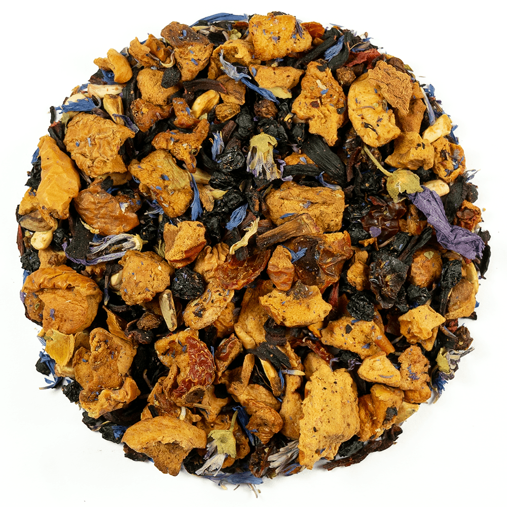 Freeze-dried Apple pieces are another key ingredient, enhancing the apple flavour and ensuring consistency. The star ingredients, Pomegranate arils and Blueberries give the tea its signature flavours, creating a harmonious balance of sweetness and tartness.
