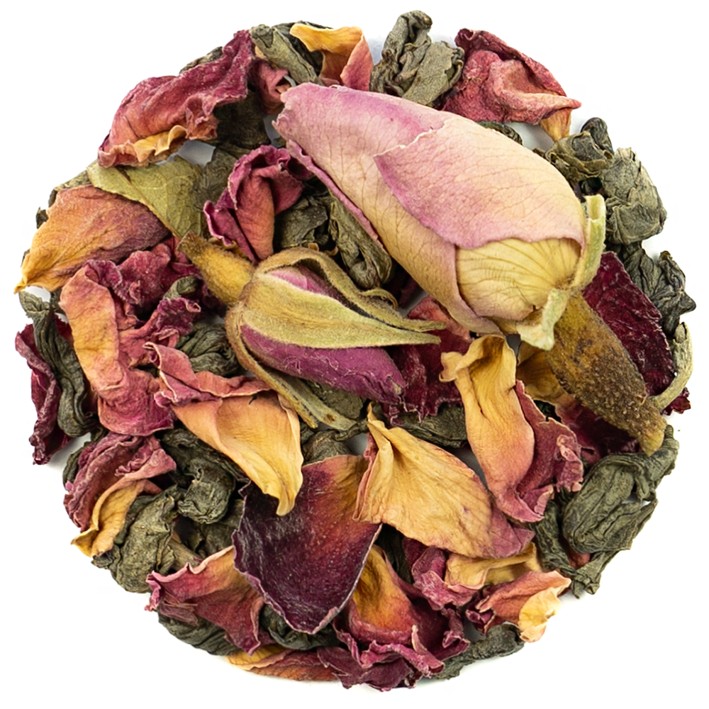 Valentine’s Green Love Tea Bend. This special blend of china green teas scented with Rose and blended with Rose petals and Rose buds. A fantastic looking green loose leaf tea with a heavenly aroma.